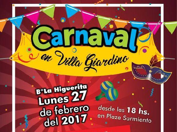 La Municipalidad de Villa Giardino invita a todos a participar de los Carnavales a realizare el próximo Lunes 27 de Febrero en el Barrio La Higuerita.Los esperamos desde las 18 hs en la Plaza Sarmiento donde habrá espectáculos infantiles, premio al mejor disfraz,murgas y comparsas, zumba,y el cierre musical con Viviana Capetto. Patio de comidas y mucha diversión.Entrada libre y gratuita
