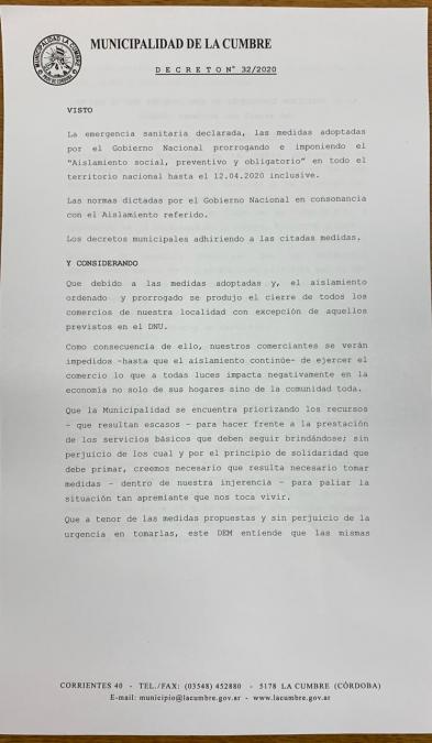 En el dia de hoy el ejecutivo de La Cumbre dió a conocer el nuevo decreto municipal 32/2020. Estos son los principales puntos. En el art.1º es adherir al Gobierno Nacional al aislamiento social hasta el 12 de Abril.LEER MAS